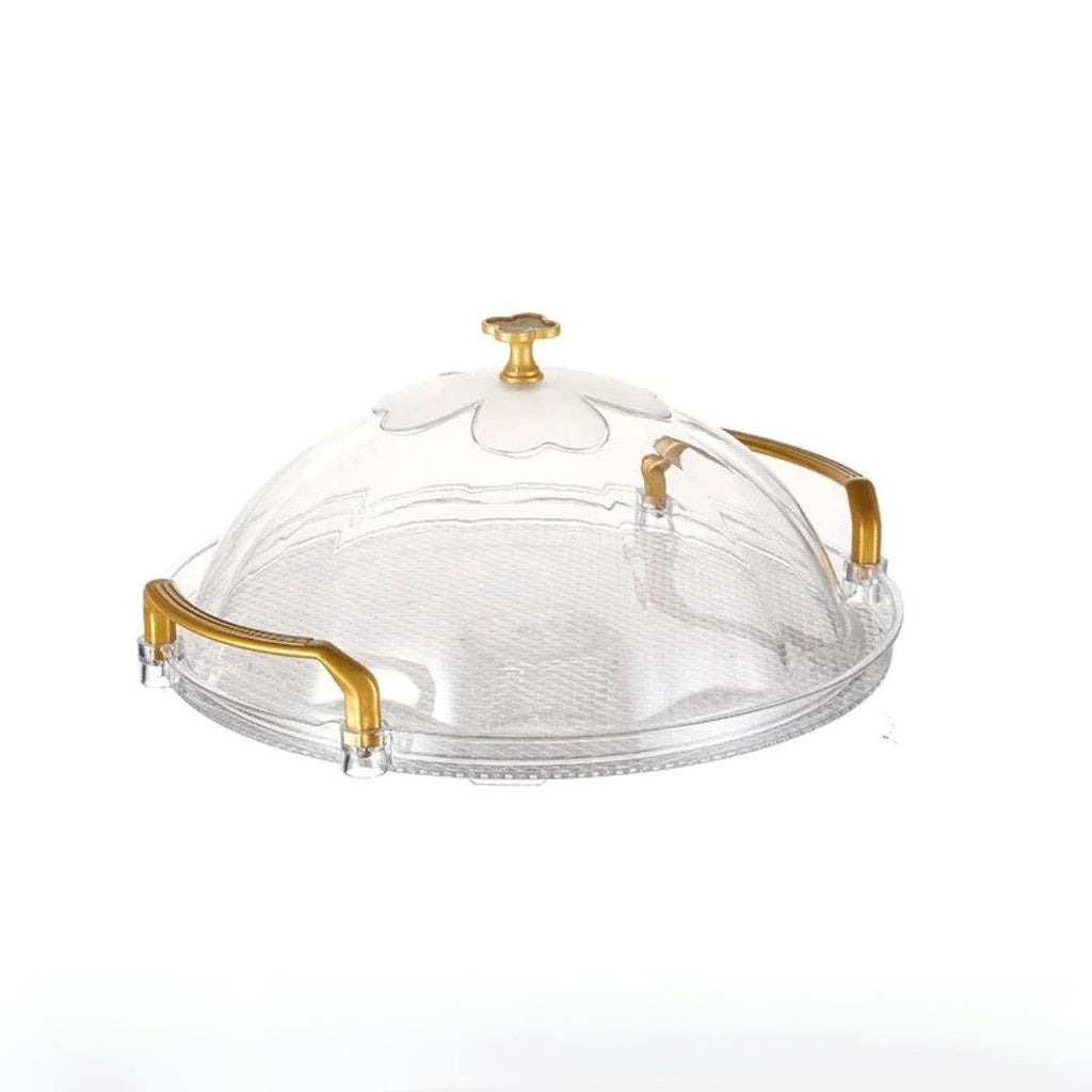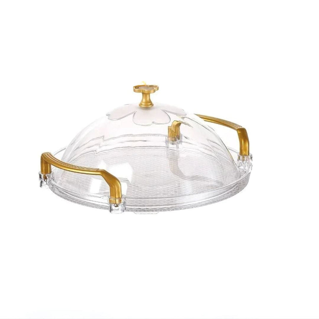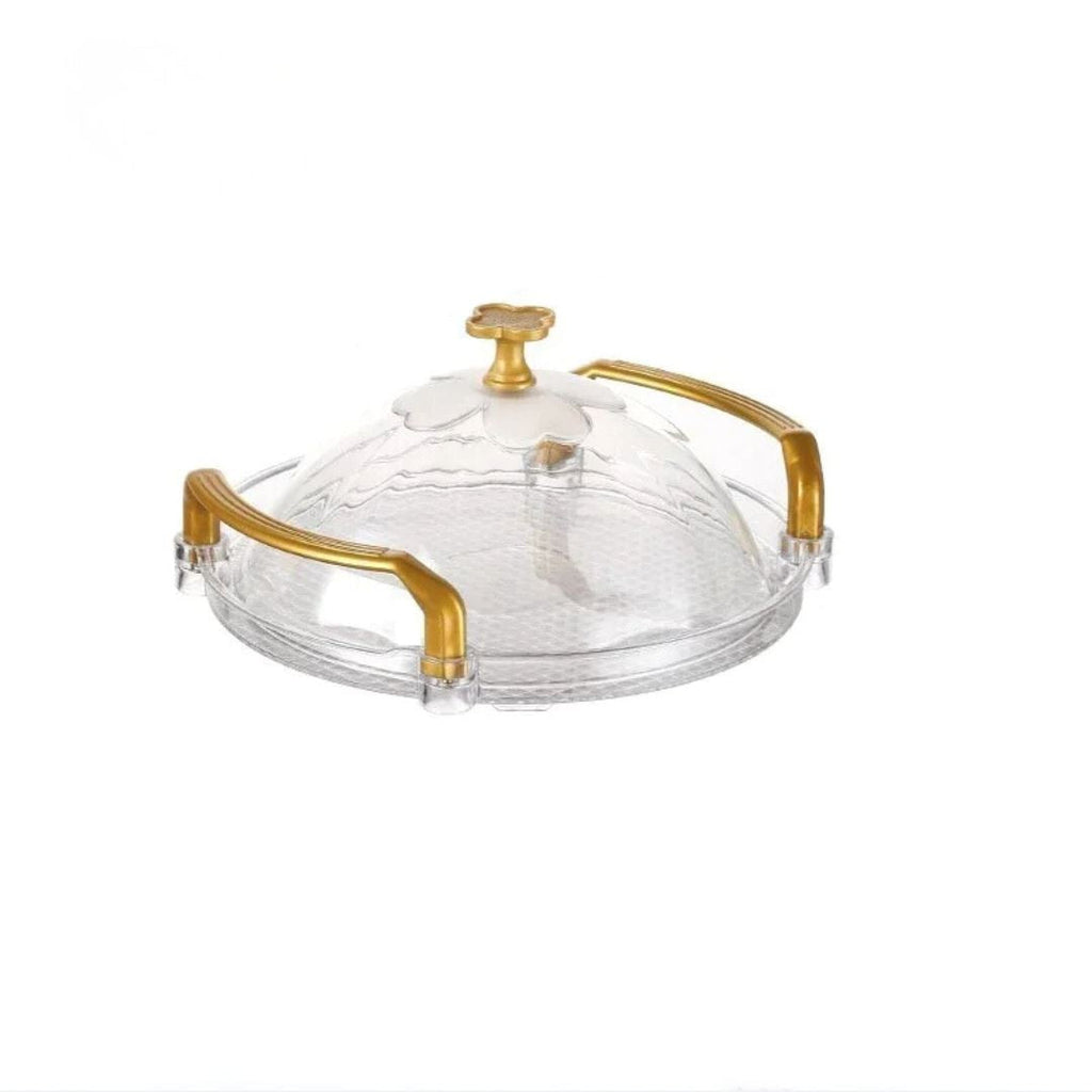 Elegância e Praticidade: Bandeja Redonda de Plástico com Acabamento Dourado e Alça Ergonômica