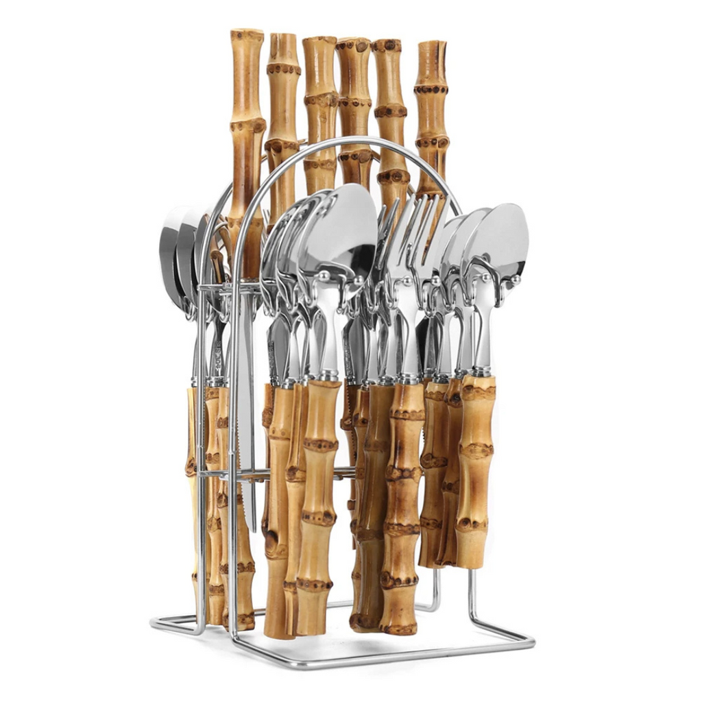 O toque rústico que sua mesa merece: Faqueiro Prata em Aço Inox com Cabo de Bambu Natural