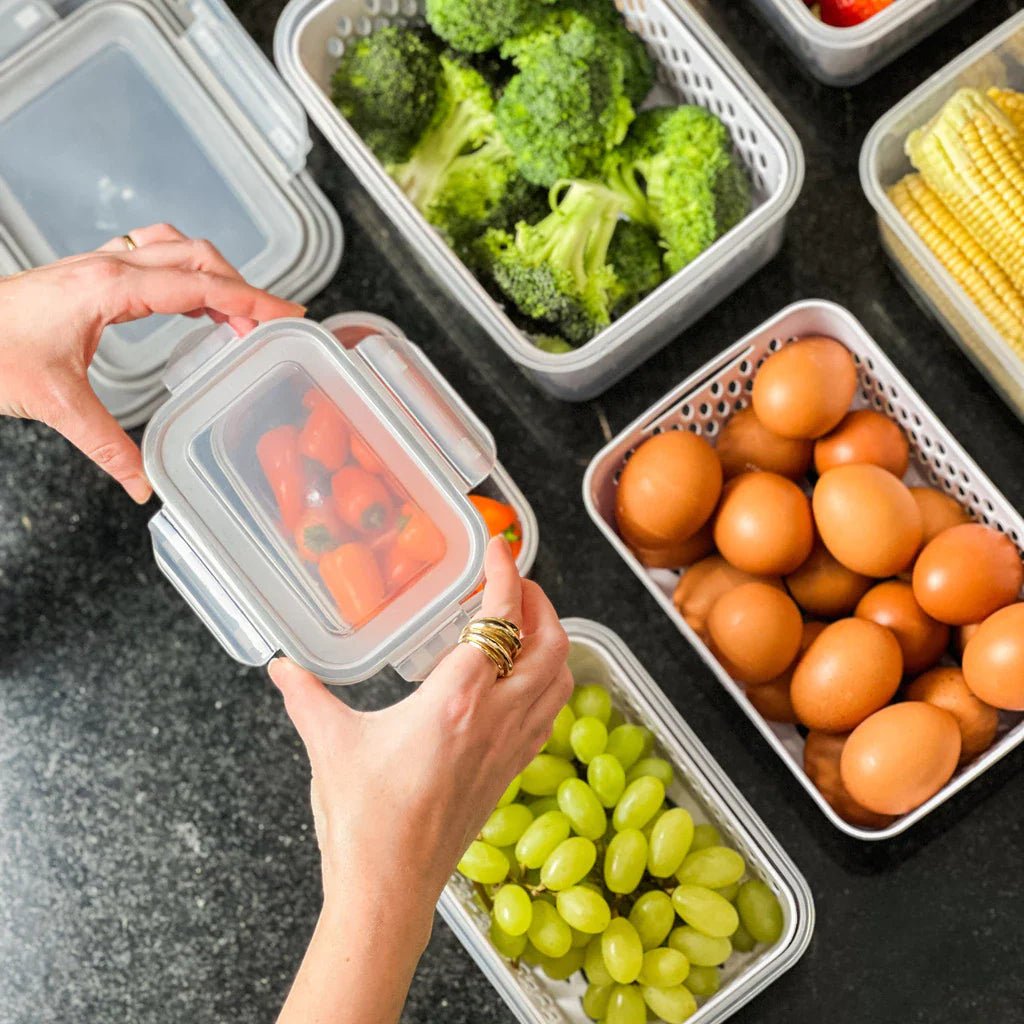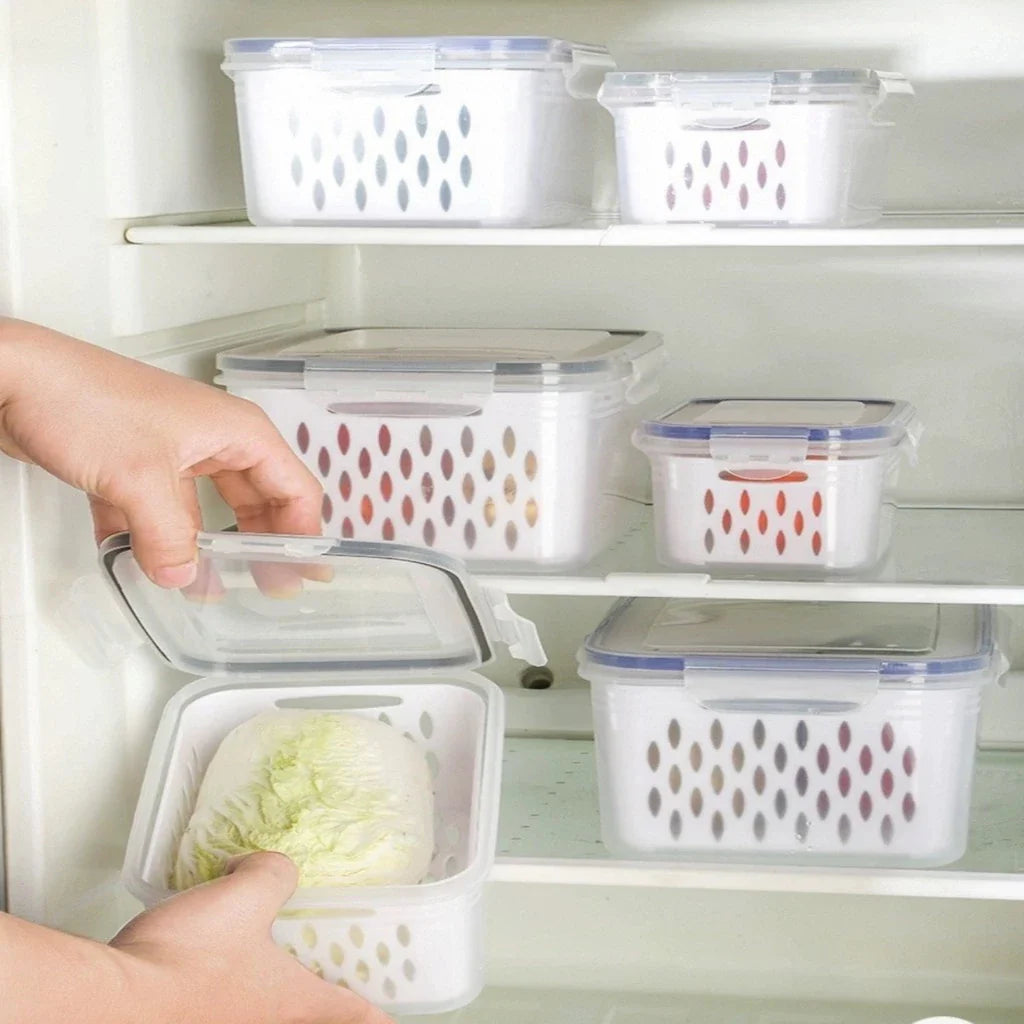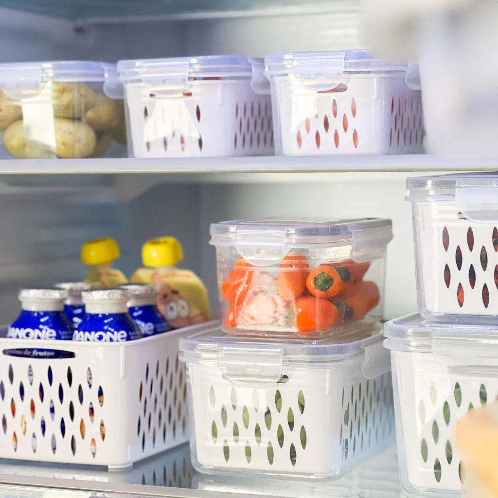 O design "matrioska" (um pote cabe dentro do outro) permite que você economize espaço no armário quando não estiver usando, enquanto o visual transparente transforma sua geladeira em uma vitrine de frescor.