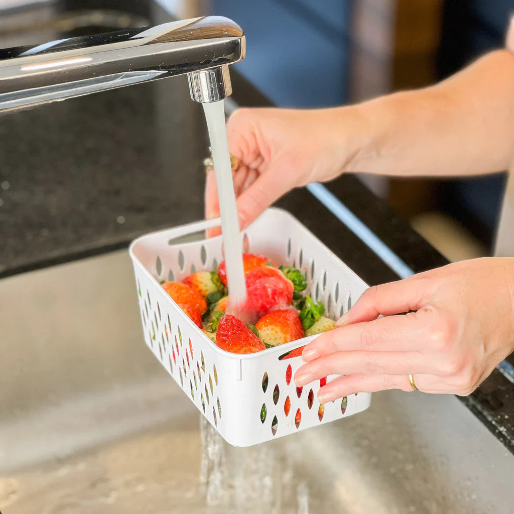 - Cesto Funcional (Escorredor): Cada pote vem com um cesto interno removível. Você lava as frutas direto no cesto sob a torneira, escorre o excesso de água e coloca direto no pote. Sem sujar louça extra.