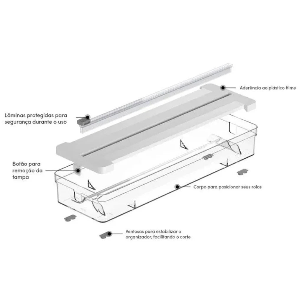 Com design transparente e minimalista, ele acomoda dois rolos simultaneamente (ex: Alumínio e Plástico Filme ou Papel Manteiga), transformando uma gaveta bagunçada em um exemplo de organização e eficiência.